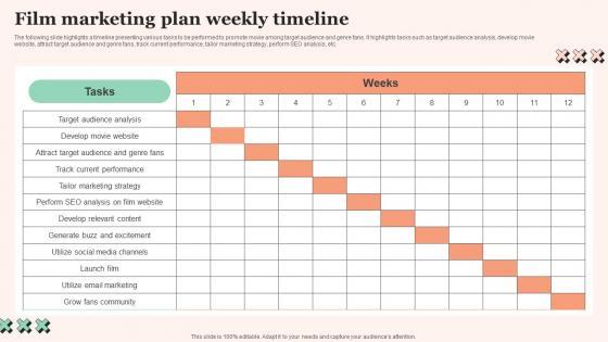 The following slide highlights a timeline presenting various tasks to be performed to promote movie among target audience and genre fans. It highlights tasks such as target audience analysis, develop movie website, attract target audience and genre fans, track current performance, tailor marketing strategy, perform SEO analysis, etc. Find a pre designed and impeccable Film Marketing Plan Film Promotional Techniques To Increase Box Office Collection Sample Pdf. The templates can ace your presentation without additional effort. You can download these easy to edit presentation templates to make your presentation stand out from others. So, what are you waiting for Download the template from Slidegeeks today and give a unique touch to your presentation. The following slide highlights a timeline presenting various tasks to be performed to promote movie among target audience and genre fans. It highlights tasks such as target audience analysis, develop movie website, attract target audience and genre fans, track current performance, tailor marketing strategy, perform SEO analysis, etc.