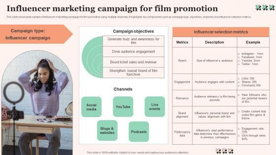 This slide showcases sample of influencer marketing campaign for film promotion using multiple channels. It highlights key components such as campaign type, objectives, channels and influencer selection metrics. Get a simple yet stunning designed Influencer Marketing Campaign Film Promotional Techniques To Increase Box Office Collection Infographics Pdf. It is the best one to establish the tone in your meetings. It is an excellent way to make your presentations highly effective. So, download this PPT today from Slidegeeks and see the positive impacts. Our easy to edit Influencer Marketing Campaign Film Promotional Techniques To Increase Box Office Collection Infographics Pdf can be your go to option for all upcoming conferences and meetings. So, what are you waiting for Grab this template today. This slide showcases sample of influencer marketing campaign for film promotion using multiple channels. It highlights key components such as campaign type, objectives, channels and influencer selection metrics.
