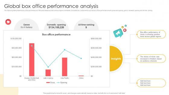 The following slide presents box office performance of film post release across various regions worldwide. It includes key components such as box office performance both gross and opening, genre, domestic opening and all time ranking. This Marketing Channels For Movie Global Box Office Performance Analysis Strategy SS V is perfect for any presentation, be it in front of clients or colleagues. It is a versatile and stylish solution for organizing your meetings. The Marketing Channels For Movie Global Box Office Performance Analysis Strategy SS V features a modern design for your presentation meetings. The adjustable and customizable slides provide unlimited possibilities for acing up your presentation. Slidegeeks has done all the homework before launching the product for you. So, do not wait, grab the presentation templates today The following slide presents box office performance of film post release across various regions worldwide. It includes key components such as box office performance both gross and opening, genre, domestic opening and all time ranking.