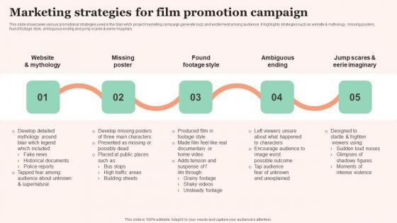 This slide showcases various promotional strategies used in the blair witch project marketing campaign generate buzz and excitement among audience. It highlights strategies such as website and mythology, missing posters, found footage style, ambiguous ending and jump scares and eerie imaginary. Are you in need of a template that can accommodate all of your creative concepts This one is crafted professionally and can be altered to fit any style. Use it with Google Slides or PowerPoint. Include striking photographs, symbols, depictions, and other visuals. Fill, move around, or remove text boxes as desired. Test out color palettes and font mixtures. Edit and save your work, or work with colleagues. Download Marketing Strategies Film Promotional Techniques To Increase Box Office Collection Clipart Pdf and observe how to make your presentation outstanding. Give an impeccable presentation to your group and make your presentation unforgettable. This slide showcases various promotional strategies used in the blair witch project marketing campaign generate buzz and excitement among audience. It highlights strategies such as website and mythology, missing posters, found footage style, ambiguous ending and jump scares and eerie imaginary.