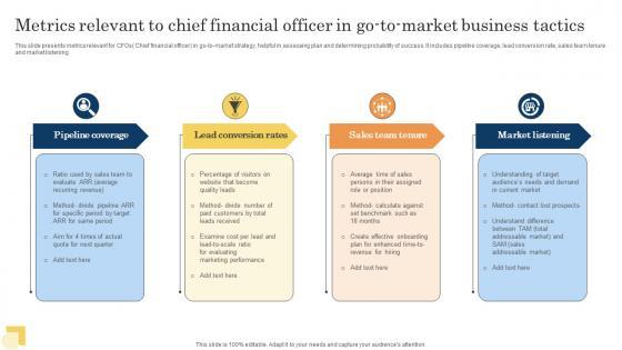 This slide presents metrics relevant for CFOs Chief financial officer in go to market strategy, helpful in assessing plan and determining probability of success. It includes pipeline coverage, lead conversion rate, sales team tenure and market listening Showcasing this set of slides titled Metrics Relevant To Chief Financial Officer In Go To Market Business Tactics Ideas Pdf. The topics addressed in these templates are Research Competitors, Develop Messaging, Set Targets. All the content presented in this PPT design is completely editable. Download it and make adjustments in color, background, font etc. as per your unique business setting. This slide presents metrics relevant for CFOs Chief financial officer in go to market strategy, helpful in assessing plan and determining probability of success. It includes pipeline coverage, lead conversion rate, sales team tenure and market listening
