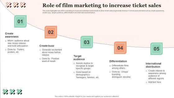 This slide highlights role of film marketing in movie and entertainment industry to drive ticket sales and generate revenue. It showcases element such as create awareness, create buzz, target audience, differentiation and international distribution. This Role Of Film Marketing To Film Promotional Techniques To Increase Box Office Collection Clipart Pdf is perfect for any presentation, be it in front of clients or colleagues. It is a versatile and stylish solution for organizing your meetings. The Role Of Film Marketing To Film Promotional Techniques To Increase Box Office Collection Clipart Pdf features a modern design for your presentation meetings. The adjustable and customizable slides provide unlimited possibilities for acing up your presentation. Slidegeeks has done all the homework before launching the product for you. So, do not wait, grab the presentation templates today This slide highlights role of film marketing in movie and entertainment industry to drive ticket sales and generate revenue. It showcases element such as create awareness, create buzz, target audience, differentiation and international distribution.