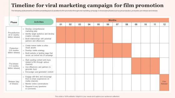 The following slide presents a timeline presenting tasks and duration for film promotion through viral marketing campaign. It showcases phases such as pre production, production, pre release and release. Slidegeeks is one of the best resources for PowerPoint templates. You can download easily and regulate Timeline For Viral Marketing Film Promotional Techniques To Increase Box Office Collection Introduction Pdf for your personal presentations from our wonderful collection. A few clicks is all it takes to discover and get the most relevant and appropriate templates. Use our Templates to add a unique zing and appeal to your presentation and meetings. All the slides are easy to edit and you can use them even for advertisement purposes. The following slide presents a timeline presenting tasks and duration for film promotion through viral marketing campaign. It showcases phases such as pre production, production, pre release and release.