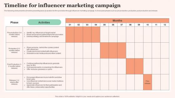 The following slide presents a timeline presenting tasks and duration for film promotion through influencer marketing campaign. It showcases phases such as pre production, production, post production and release. Want to ace your presentation in front of a live audience Our Timeline Influencer Marketing Film Promotional Techniques To Increase Box Office Collection Microsoft Pdf can help you do that by engaging all the users towards you. Slidegeeks experts have put their efforts and expertise into creating these impeccable powerpoint presentations so that you can communicate your ideas clearly. Moreover, all the templates are customizable, and easy to edit and downloadable. Use these for both personal and commercial use. The following slide presents a timeline presenting tasks and duration for film promotion through influencer marketing campaign. It showcases phases such as pre production, production, post production and release.