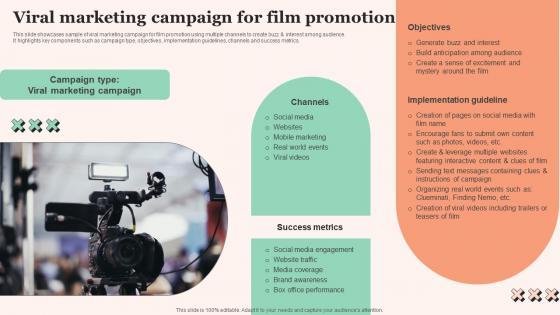 This slide showcases sample of viral marketing campaign for film promotion using multiple channels to create buzz and interest among audience. It highlights key components such as campaign type, objectives, implementation guidelines, channels and success metrics. Present like a pro with Viral Marketing Campaign For Film Promotional Techniques To Increase Box Office Collection Clipart Pdf Create beautiful presentations together with your team, using our easy to use presentation slides. Share your ideas in real time and make changes on the fly by downloading our templates. So whether you are in the office, on the go, or in a remote location, you can stay in sync with your team and present your ideas with confidence. With Slidegeeks presentation got a whole lot easier. Grab these presentations today. This slide showcases sample of viral marketing campaign for film promotion using multiple channels to create buzz and interest among audience. It highlights key components such as campaign type, objectives, implementation guidelines, channels and success metrics.