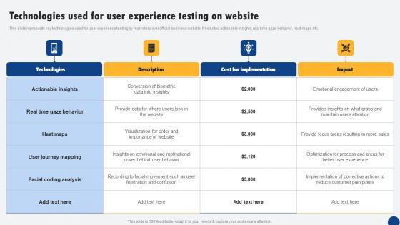 This slide represents key technologies used for user experience testing by marketers over official business website. It includes actionable insights, real time gaze behavior, heat maps etc. Get a simple yet stunning designed Technologies Used For User Experience Testing On Website Driven Digital Marketing Background Pdf. It is the best one to establish the tone in your meetings. It is an excellent way to make your presentations highly effective. So, download this PPT today from Slidegeeks and see the positive impacts. Our easy-to-edit Technologies Used For User Experience Testing On Website Driven Digital Marketing Background Pdf can be your go-to option for all upcoming conferences and meetings. So, what are you waiting for Grab this template today. This slide represents key technologies used for user experience testing by marketers over official business website. It includes actionable insights, real time gaze behavior, heat maps etc.