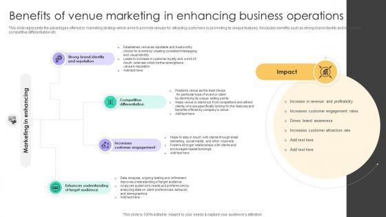 This slide represents the advantages offered by marketing strategy which aims to promote venues for attracting customers by promoting its unique features. It includes benefits such as strong brand identity and reputation, competitive differentiation etc. Slidegeeks is one of the best resources for PowerPoint templates. You can download easily and regulate Online Venue Advertising Plan Benefits Of Venue Marketing In Enhancing Business Operations Strategy SS V for your personal presentations from our wonderful collection. A few clicks is all it takes to discover and get the most relevant and appropriate templates. Use our Templates to add a unique zing and appeal to your presentation and meetings. All the slides are easy to edit and you can use them even for advertisement purposes. This slide represents the advantages offered by marketing strategy which aims to promote venues for attracting customers by promoting its unique features. It includes benefits such as strong brand identity and reputation, competitive differentiation etc.