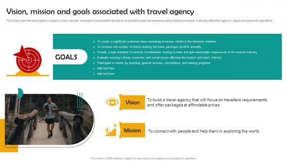 This slide covers the travel agency industrys vision, mission, and goals to ensure that it will deliver an excellent customer experience when selling travel plans. It will also reflect the agencys culture and reason for operations. If you are looking for a format to display your unique thoughts, then the professionally designed Vision Mission And Goals Group Tour Operator Business Plan Go To Market Strategy Rules Pdf is the one for you. You can use it as a Google Slides template or a PowerPoint template. Incorporate impressive visuals, symbols, images, and other charts. Modify or reorganize the text boxes as you desire. Experiment with shade schemes and font pairings. Alter, share or cooperate with other people on your work. Download Vision Mission And Goals Group Tour Operator Business Plan Go To Market Strategy Rules Pdf and find out how to give a successful presentation. Present a perfect display to your team and make your presentation unforgettable. This slide covers the travel agency industrys vision, mission, and goals to ensure that it will deliver an excellent customer experience when selling travel plans. It will also reflect the agencys culture and reason for operations.