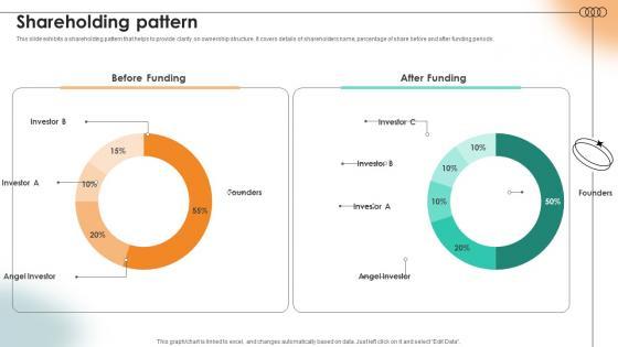 This slide exhibits a shareholding pattern that helps to provide clarity on ownership structure. It covers details of shareholders name, percentage of share before and after funding periods. Welcome to our selection of the Shareholding Pattern Content Marketing Platform Investor Funding Elevator Pitch Deck. These are designed to help you showcase your creativity and bring your sphere to life. Planning and Innovation are essential for any business that is just starting out. This collection contains the designs that you need for your everyday presentations. All of our PowerPoints are 100Percent editable, so you can customize them to suit your needs. This multi-purpose template can be used in various situations. Grab these presentation templates today. This slide exhibits a shareholding pattern that helps to provide clarity on ownership structure. It covers details of shareholders name, percentage of share before and after funding periods.