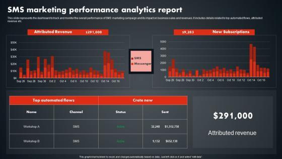 This slide represents the dashboard to track and monitor the overall performance of SMS marketing campaign and its impact on business sales and revenues. It includes details related to top automated flows, attributed revenue etc. This SMS Marketing Performance Analytics Report Summary PDF from Slidegeeks makes it easy to present information on your topic with precision. It provides customization options, so you can make changes to the colors, design, graphics, or any other component to create a unique layout. It is also available for immediate download, so you can begin using it right away. Slidegeeks has done good research to ensure that you have everything you need to make your presentation stand out. Make a name out there for a brilliant performance.