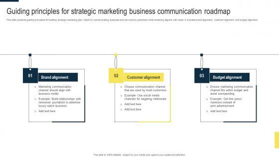 This slide presents guiding principles for building strategic marketing plan, helpful in communicating business and services to customers while remaining aligned with vision. It includes brand alignment, customer alignment and budget alignment. Pitch your topic with ease and precision using this Guiding Principles For Strategic Marketing Business Communication Roadmap Ideas Pdf. This layout presents information on Brand Alignment, Customer Alignment, Budget Alignment. It is also available for immediate download and adjustment. So, changes can be made in the color, design, graphics or any other component to create a unique layout. This slide presents guiding principles for building strategic marketing plan, helpful in communicating business and services to customers while remaining aligned with vision. It includes brand alignment, customer alignment and budget alignment.