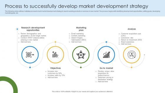 The following slide outlines multistep process to build market development strategy to launch existing products or services in new market. The process begins with identifying development opportunities, setting goals, developing marketing plan, etc. There are so many reasons you need a Process To Successfully Develop Market Development Strategy Information PDF. The first reason is you can not spend time making everything from scratch, Thus, Slidegeeks has made presentation templates for you too. You can easily download these templates from our website easily.