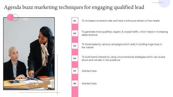 Find a pre designed and impeccable Agenda Buzz Marketing Techniques For Engaging Qualified Lead Slides Pdf. The templates can ace your presentation without additional effort. You can download these easy to edit presentation templates to make your presentation stand out from others. So, what are you waiting for Download the template from Slidegeeks today and give a unique touch to your presentation. Our Agenda Buzz Marketing Techniques For Engaging Qualified Lead Slides Pdf are topically designed to provide an attractive backdrop to any subject. Use them to look like a presentation pro.