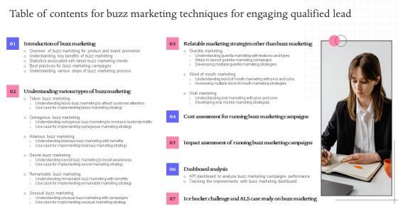 If your project calls for a presentation, then Slidegeeks is your go to partner because we have professionally designed, easy to edit templates that are perfect for any presentation. After downloading, you can easily edit Table Of Contents For Buzz Marketing Techniques For Engaging Qualified Lead Download Pdf and make the changes accordingly. You can rearrange slides or fill them with different images. Check out all the handy templates Our Table Of Contents For Buzz Marketing Techniques For Engaging Qualified Lead Download Pdf are topically designed to provide an attractive backdrop to any subject. Use them to look like a presentation pro.