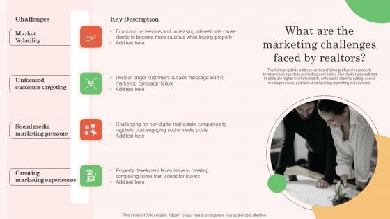 The following slide outlines various challenges faced by property developers or agents in promoting new listing. The challenges outlined in slide are higher market volatility, unfocused client targeting, social media pressure, and lack of compelling marketing experiences. Find a pre-designed and impeccable What Are The Marketing Challenges Faced By Realtors Out Of The Box Real Professional Pdf The templates can ace your presentation without additional effort. You can download these easy-to-edit presentation templates to make your presentation stand out from others. So, what are you waiting for Download the template from Slidegeeks today and give a unique touch to your presentation. The following slide outlines various challenges faced by property developers or agents in promoting new listing. The challenges outlined in slide are higher market volatility, unfocused client targeting, social media pressure, and lack of compelling marketing experiences.