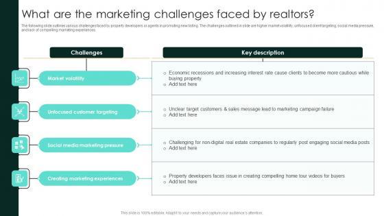 The following slide outlines various challenges faced by property developers or agents in promoting new listing. The challenges outlined in slide are higher market volatility, unfocused client targeting, social media pressure, and lack of compelling marketing experiences. Do you know about Slidesgeeks What Are The Marketing Challenges Faced By Realtors Strategic Real Estate Information Pdf These are perfect for delivering any kind od presentation. Using it, create PowerPoint presentations that communicate your ideas and engage audiences. Save time and effort by using our pre-designed presentation templates that are perfect for a wide range of topic. Our vast selection of designs covers a range of styles, from creative to business, and are all highly customizable and easy to edit. Download as a PowerPoint template or use them as Google Slides themes. The following slide outlines various challenges faced by property developers or agents in promoting new listing. The challenges outlined in slide are higher market volatility, unfocused client targeting, social media pressure, and lack of compelling marketing experiences.