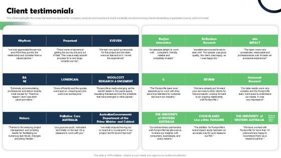 The slide highlights the customer testimonials post for company services and services to build credibility and trust among clients illustrating organization name, and comment. Do you have to make sure that everyone on your team knows about any specific topic I yes, then you should give PRODUCT NAME a try. Our experts have put a lot of knowledge and effort into creating this impeccable Client Testimonials Marketing Research Services Management Business Designs Pdf. You can use this template for your upcoming presentations, as the slides are perfect to represent even the tiniest detail. You can download these templates from the Slidegeeks website and these are easy to edit. So grab these today. The slide highlights the customer testimonials post for company services and services to build credibility and trust among clients illustrating organization name, and comment.