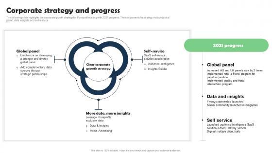 The following slide highlights the corporate growth strategy for Pureprofile along with 2021 progress. The components for strategy include global panel, data insights, and self-service. Do you have an important presentation coming up Are you looking for something that will make your presentation stand out from the rest Look no further than Corporate Strategy Marketing Research Services Management Business Diagrams Pdf. With our professional designs, you can trust that your presentation will pop and make delivering it a smooth process. And with Slidegeeks, you can trust that your presentation will be unique and memorable. So why wait Grab Corporate Strategy Marketing Research Services Management Business Diagrams Pdf today and make your presentation stand out from the rest. The following slide highlights the corporate growth strategy for Pureprofile along with 2021 progress. The components for strategy include global panel, data insights, and self-service.