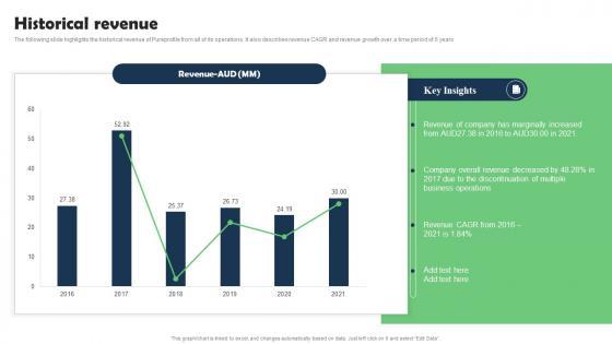 The following slide highlights the historical revenue of Pureprofile from all of its operations. It also describes revenue CAGR and revenue growth over a time period of 6 years. Formulating a presentation can take up a lot of effort and time, so the content and message should always be the primary focus. The visuals of the PowerPoint can enhance the presenters message, so our Historical Revenue Marketing Research Services Management Business Slides Pdf was created to help save time. Instead of worrying about the design, the presenter can concentrate on the message while our designers work on creating the ideal templates for whatever situation is needed. Slidegeeks has experts for everything from amazing designs to valuable content, we have put everything into Historical Revenue Marketing Research Services Management Business Slides Pdf The following slide highlights the historical revenue of Pureprofile from all of its operations. It also describes revenue CAGR and revenue growth over a time period of 6 years.