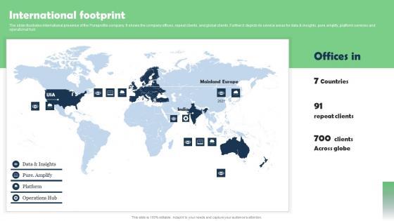 The slide illustrates international presence of the Pureprofile company. It shows the company offices, repeat clients, and global clients. Further it depicts its service areas for data and insights, pure.amplify, platform services and operational hub. This modern and well-arranged International Footprint Marketing Research Services Management Business Themes Pdf provides lots of creative possibilities. It is very simple to customize and edit with the Powerpoint Software. Just drag and drop your pictures into the shapes. All facets of this template can be edited with Powerpoint no extra software is necessary. Add your own material, put your images in the places assigned for them, adjust the colors, and then you can show your slides to the world, with an animated slide included. The slide illustrates international presence of the Pureprofile company. It shows the company offices, repeat clients, and global clients. Further it depicts its service areas for data and insights, pure.amplify, platform services and operational hub.