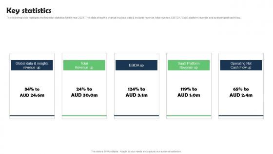 The following slide highlights the financial statistics for the year 2021. The stats show the change in global data and insights revenue, total revenue, EBITDA, SaaS platform revenue and operating net cash flow. Welcome to our selection of the Key Statistics Marketing Research Services Management Business Pictures Pdf. These are designed to help you showcase your creativity and bring your sphere to life. Planning and Innovation are essential for any business that is just starting out. This collection contains the designs that you need for your everyday presentations. All of our PowerPoints are 100 percent editable, so you can customize them to suit your needs. This multi-purpose template can be used in various situations. Grab these presentation templates today. The following slide highlights the financial statistics for the year 2021. The stats show the change in global data and insights revenue, total revenue, EBITDA, SaaS platform revenue and operating net cash flow.