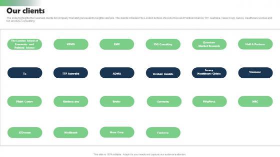 The slide highlights the business clients for company marketing and research insights services. The clients includes The London School of Economics and Political Science, TTF Australia, News Corp, Survey Healthcare Globus and fun and IDG Consulting. Retrieve professionally designed Our Clients Marketing Research Services Management Business Information Pdf to effectively convey your message and captivate your listeners. Save time by selecting pre-made slideshows that are appropriate for various topics, from business to educational purposes. These themes come in many different styles, from creative to corporate, and all of them are easily adjustable and can be edited quickly. Access them as PowerPoint templates or as Google Slides themes. You do not have to go on a hunt for the perfect presentation because Slidegeeks got you covered from everywhere. The slide highlights the business clients for company marketing and research insights services. The clients includes The London School of Economics and Political Science, TTF Australia, News Corp, Survey Healthcare Globus and fun and IDG Consulting.