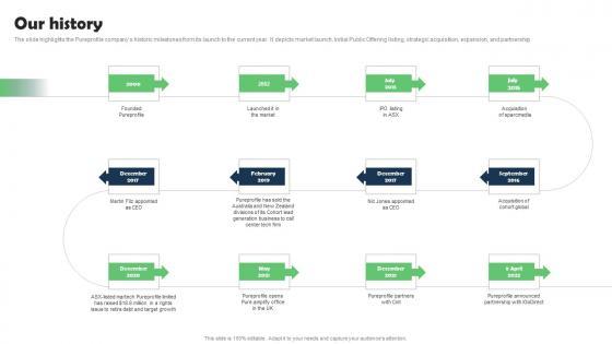 The slide highlights the Pureprofile companys historic milestones from its launch to the current year. It depicts market launch, Initial Public Offering listing, strategic acquisition, expansion, and partnership. Presenting this PowerPoint presentation, titled Our History Marketing Research Services Management Business Elements Pdf, with topics curated by our researchers after extensive research. This editable presentation is available for immediate download and provides attractive features when used. Download now and captivate your audience. Presenting this Our History Marketing Research Services Management Business Elements Pdf. Our researchers have carefully researched and created these slides with all aspects taken into consideration. This is a completely customizable Our History Marketing Research Services Management Business Elements Pdf that is available for immediate downloading. Download now and make an impact on your audience. Highlight the attractive features available with our PPTs. The slide highlights the Pureprofile companys historic milestones from its launch to the current year. It depicts market launch, Initial Public Offering listing, strategic acquisition, expansion, and partnership.