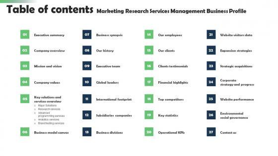 Boost your pitch with our creative Table Of Contents Marketing Research Services Management Business Profile Guidelines Pdf. Deliver an awe-inspiring pitch that will mesmerize everyone. Using these presentation templates you will surely catch everyones attention. You can browse the ppts collection on our website. We have researchers who are experts at creating the right content for the templates. So you do not have to invest time in any additional work. Just grab the template now and use them. Our Table Of Contents Marketing Research Services Management Business Profile Guidelines Pdf are topically designed to provide an attractive backdrop to any subject. Use them to look like a presentation pro.