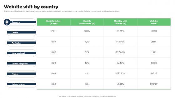 The following slide highlights the company website performance in countries. It shows country name, monthly visit share, monthly visit growth and website rank. Slidegeeks is one of the best resources for PowerPoint templates. You can download easily and regulate Website Visit By Country Marketing Research Services Management Business Clipart Pdf for your personal presentations from our wonderful collection. A few clicks is all it takes to discover and get the most relevant and appropriate templates. Use our Templates to add a unique zing and appeal to your presentation and meetings. All the slides are easy to edit and you can use them even for advertisement purposes. The following slide highlights the company website performance in countries. It shows country name, monthly visit share, monthly visit growth and website rank.