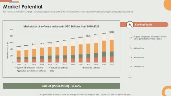 This slide shows information regarding the market size or opportunities available for the company in coming years. It also shows the details regarding the compound annual growth rate. If you are looking for a format to display your unique thoughts, then the professionally designed Market Potential E Commerce Solutions Offering Company Fundraising Pitch Deck is the one for you. You can use it as a Google Slides template or a PowerPoint template. Incorporate impressive visuals, symbols, images, and other charts. Modify or reorganize the text boxes as you desire. Experiment with shade schemes and font pairings. Alter, share or cooperate with other people on your work. Download Market Potential E Commerce Solutions Offering Company Fundraising Pitch Deck and find out how to give a successful presentation. Present a perfect display to your team and make your presentation unforgettable. This slide shows information regarding the market size or opportunities available for the company in coming years. It also shows the details regarding the compound annual growth rate.