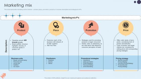 This slide represents marketing mix for Unilever product, place, promotion, and price. It includes description and strategies for 4Ps. Are you searching for a Marketing Mix Home Care Solutions Company Profile CP SS V that is uncluttered, straightforward, and original Its easy to edit, and you can change the colors to suit your personal or business branding. For a presentation that expresses how much effort you have put in, this template is ideal With all of its features, including tables, diagrams, statistics, and lists, its perfect for a business plan presentation. Make your ideas more appealing with these professional slides. Download Marketing Mix Home Care Solutions Company Profile CP SS V from Slidegeeks today. This slide represents marketing mix for Unilever product, place, promotion, and price. It includes description and strategies for 4Ps.
