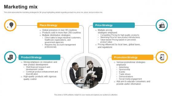 This slide represents the marketing strategies for 3M group highlighting details regarding product mix, price mix, place, and promotion mix.Make sure to capture your audiences attention in your business displays with our gratis customizable Marketing Mix Innovative Industrial Solutions Company Profile CP SS V. These are great for business strategies, office conferences, capital raising or task suggestions. If you desire to acquire more customers for your tech business and ensure they stay satisfied, create your own sales presentation with these plain slides. This slide represents the marketing strategies for 3M group highlighting details regarding product mix, price mix, place, and promotion mix.
