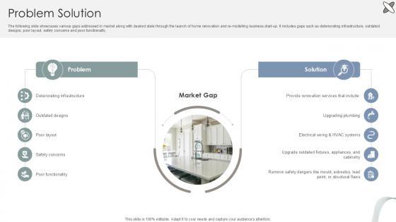 The following slide showcases various gaps addressed in market along with desired state through the launch of home renovation and re-modelling business start-up. It includes gaps such as deteriorating infrastructure, outdated designs, poor layout, safety concerns and poor functionality. Formulating a presentation can take up a lot of effort and time, so the content and message should always be the primary focus. The visuals of the PowerPoint can enhance the presenters message, so our Problem Solution Interior Design Company Market Entry Plan PPT Example GTM SS V was created to help save time. Instead of worrying about the design, the presenter can concentrate on the message while our designers work on creating the ideal templates for whatever situation is needed. Slidegeeks has experts for everything from amazing designs to valuable content, we have put everything into Problem Solution Interior Design Company Market Entry Plan PPT Example GTM SS V The following slide showcases various gaps addressed in market along with desired state through the launch of home renovation and re-modelling business start-up. It includes gaps such as deteriorating infrastructure, outdated designs, poor layout, safety concerns and poor functionality.