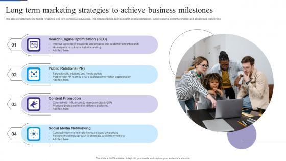 This slide exhibits marketing tactics for gaining long term competitive advantage. This includes tactics such as search engine optimization, public relations, content promotion and social media networking. Showcasing this set of slides titled Long Term Marketing Strategies To Achieve Business Milestones Themes Pdf. The topics addressed in these templates are Public Relations, Content Promotion, Social Media Networking. All the content presented in this PPT design is completely editable. Download it and make adjustments in color, background, font etc. as per your unique business setting. This slide exhibits marketing tactics for gaining long term competitive advantage. This includes tactics such as search engine optimization, public relations, content promotion and social media networking.