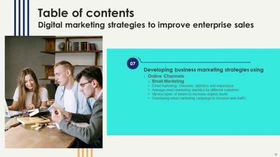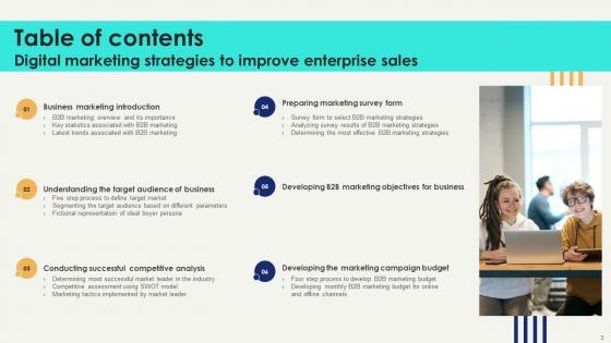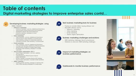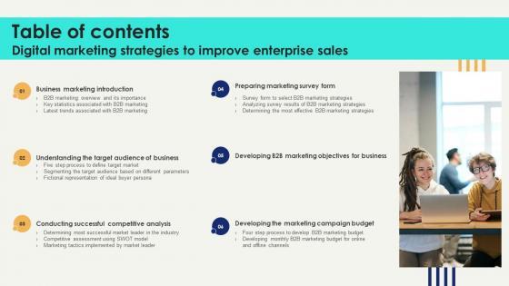 Explore a selection of the finest Digital Marketing Strategies To Improve Enterprise Sales Table Of Contents Infographics Pdf here. With a plethora of professionally designed and pre made slide templates, you can quickly and easily find the right one for your upcoming presentation. You can use our Digital Marketing Strategies To Improve Enterprise Sales Table Of Contents.Ppt to effectively convey your message to a wider audience. Slidegeeks has done a lot of research before preparing these presentation templates. The content can be personalized and the slides are highly editable. Grab templates today from Slidegeeks. Our Digital Marketing Strategies To Improve Enterprise Sales Table Of Contents Infographics Pdf are topically designed to provide an attractive backdrop to any subject. Use them to look like a presentation pro.