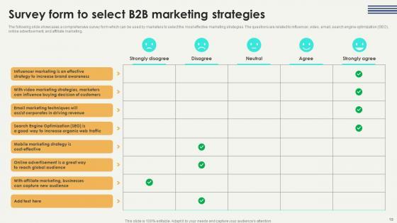 The following slide showcases a comprehensive survey form which can be used by marketers to select the most effective marketing strategies. The questions are related to influencer, video, email, search engine optimization SEO, online advertisement, and affiliate marketing. Slidegeeks is here to make your presentations a breeze with Survey Form To Select Digital Marketing Strategies Improve Enterprise Sales Formats Pdf With our easy to use and customizable templates, you can focus on delivering your ideas rather than worrying about formatting. With a variety of designs to choose from, you are sure to find one that suits your needs. And with animations and unique photos, illustrations, and fonts, you can make your presentation pop. So whether you are giving a sales pitch or presenting to the board, make sure to check out Slidegeeks first The following slide showcases a comprehensive survey form which can be used by marketers to select the most effective marketing strategies. The questions are related to influencer, video, email, search engine optimization SEO, online advertisement, and affiliate marketing.