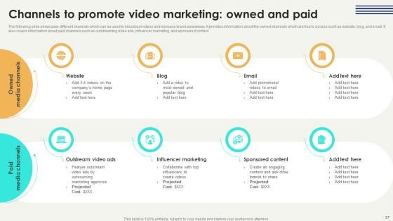 The following slide showcases different channels which can be used to broadcast videos and increase brand awareness. It provides information about the owned channels which are free to access such as website, blog, and email. It also covers information about paid channels such as outstreaming video ads, influencer marketing, and sponsored content. Find highly impressive Channels To Promote Video Digital Marketing Strategies Improve Enterprise Sales Graphics Pdf on Slidegeeks to deliver a meaningful presentation. You can save an ample amount of time using these presentation templates. No need to worry to prepare everything from scratch because Slidegeeks experts have already done a huge research and work for you. You need to download Channels To Promote Video Digital Marketing Strategies Improve Enterprise Sales Graphics Pdf for your upcoming presentation. All the presentation templates are 100 percent editable and you can change the color and personalize the content accordingly. Download now The following slide showcases different channels which can be used to broadcast videos and increase brand awareness. It provides information about the owned channels which are free to access such as website, blog, and email. It also covers information about paid channels such as outstreaming video ads, influencer marketing, and sponsored content.