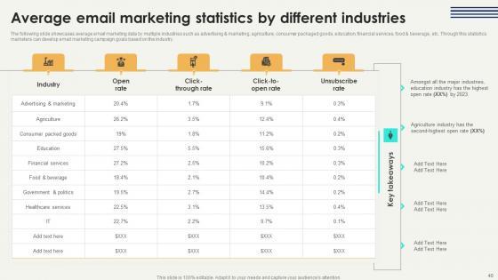 The following slide showcases average email marketing data by multiple industries such as advertising and marketing, agriculture, consumer packaged goods, education, financial services, food and beverage, etc. Through this statistics marketers can develop email marketing campaign goals based on the industry. Get a simple yet stunning designed Average Email Marketing Digital Marketing Strategies To Improve Enterprise Sales Graphics Pdf. It is the best one to establish the tone in your meetings. It is an excellent way to make your presentations highly effective. So, download this PPT today from Slidegeeks and see the positive impacts. Our easy to edit Average Email Marketing Digital Marketing Strategies To Improve Enterprise Sales Graphics Pdf can be your go to option for all upcoming conferences and meetings. So, what are you waiting for Grab this template today. The following slide showcases average email marketing data by multiple industries such as advertising and marketing, agriculture, consumer packaged goods, education, financial services, food and beverage, etc. Through this statistics marketers can develop email marketing campaign goals based on the industry.