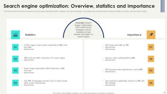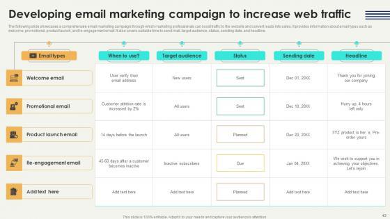 This Digital Marketing Strategies To Improve Enterprise Sales Ppt Powerpoint Presentation Complete Deck is meant for audiences who need a new vision and mission to bring energy back to their enterprise. The eighty four slides in the complete deck complement the spirit of risk taking and investment that the adventure of business requires. There is also scope for ample customization,which is a hallmark of a good presentation. Improvise on the presentations or even while you make your point before you esteemed audience. There is no better way to win new clients in business than a passionate presentation; we have the raw material,what is stopping you from giving your best Download now and showcase your business potential to the world. Our Digital Marketing Strategies To Improve Enterprise Sales Ppt Powerpoint Presentation Complete Deck are topically designed to provide an attractive backdrop to any subject. Use them to look like a presentation pro.