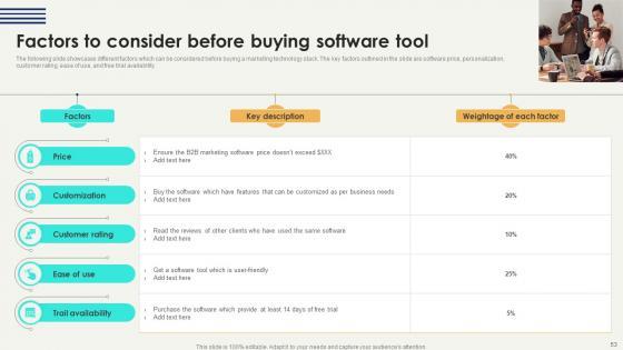 The following slide showcases different factors which can be considered before buying a marketing technology stack. The key factors outlined in the slide are software price, personalization, customer rating, ease of use, and free trial availability. Are you searching for a Factors To Consider Before Digital Marketing Strategies Improve Enterprise Sales Summary Pdf that is uncluttered, straightforward, and original Its easy to edit, and you can change the colors to suit your personal or business branding. For a presentation that expresses how much effort you have put in, this template is ideal With all of its features, including tables, diagrams, statistics, and lists, its perfect for a business plan presentation. Make your ideas more appealing with these professional slides. Download Factors To Consider Before Digital Marketing Strategies Improve Enterprise Sales Summary Pdf from Slidegeeks today. The following slide showcases different factors which can be considered before buying a marketing technology stack. The key factors outlined in the slide are software price, personalization, customer rating, ease of use, and free trial availability.