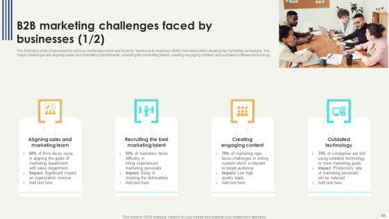 The following slide showcases the various challenges which are faced by business to business B2B marketers while developing marketing campaigns. The major challenges are aligning sales and marketing departments, selecting the marketing talent, creating engaging content, and outdated software technology. From laying roadmaps to briefing everything in detail, our templates are perfect for you. You can set the stage with your presentation slides. All you have to do is download these easy to edit and customizable templates. B2B Marketing Challenges Digital Marketing Strategies To Improve Enterprise Sales Information Pdf will help you deliver an outstanding performance that everyone would remember and praise you for. Do download this presentation today. The following slide showcases the various challenges which are faced by business to business B2B marketers while developing marketing campaigns. The major challenges are aligning sales and marketing departments, selecting the marketing talent, creating engaging content, and outdated software technology.