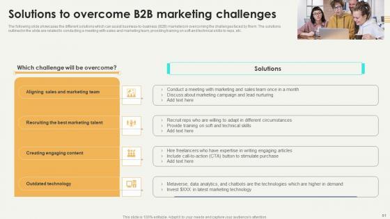 The following slide showcases the different solutions which can assist business to business B2B marketers in overcoming the challenges faced by them. The solutions outlined in the slide are related to conducting a meeting with sales and marketing team, providing training on soft and technical skills to reps, etc. From laying roadmaps to briefing everything in detail, our templates are perfect for you. You can set the stage with your presentation slides. All you have to do is download these easy to edit and customizable templates. Solutions To Overcome B2B Digital Marketing Strategies Improve Enterprise Sales Summary Pdf will help you deliver an outstanding performance that everyone would remember and praise you for. Do download this presentation today. The following slide showcases the different solutions which can assist business to business B2B marketers in overcoming the challenges faced by them. The solutions outlined in the slide are related to conducting a meeting with sales and marketing team, providing training on soft and technical skills to reps, etc.