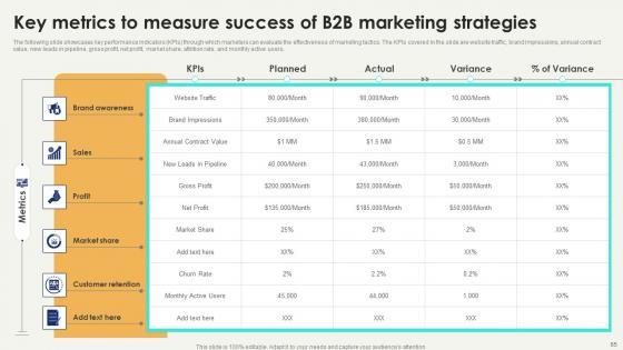 The following slide showcases key performance indicators KPIs through which marketers can evaluate the effectiveness of marketing tactics. The KPIs covered in the slide are website traffic, brand impressions, annual contract value, new leads in pipeline, gross profit, net profit, market share, attrition rate, and monthly active users. Do you know about Slidesgeeks Key Metrics To Measure Success Digital Marketing Strategies Improve Enterprise Sales Icons Pdf These are perfect for delivering any kind od presentation. Using it, create PowerPoint presentations that communicate your ideas and engage audiences. Save time and effort by using our pre designed presentation templates that are perfect for a wide range of topic. Our vast selection of designs covers a range of styles, from creative to business, and are all highly customizable and easy to edit. Download as a PowerPoint template or use them as Google Slides themes. The following slide showcases key performance indicators KPIs through which marketers can evaluate the effectiveness of marketing tactics. The KPIs covered in the slide are website traffic, brand impressions, annual contract value, new leads in pipeline, gross profit, net profit, market share, attrition rate, and monthly active users.