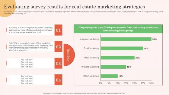 The following slide outlines the survey results of real estate promotional techniques. It provides detailed information about survey participants, tool used to derive survey results and strategies such as Instagram marketing, email marketing, video marketing, etc.If your project calls for a presentation, then Slidegeeks is your go-to partner because we have professionally designed, easy-to-edit templates that are perfect for any presentation. After downloading, you can easily edit Evaluating Survey Results For Real Estate Marketing Strategies Real Estate Property Marketing Topics Pdf and make the changes accordingly. You can rearrange slides or fill them with different images. Check out all the handy templates The following slide outlines the survey results of real estate promotional techniques. It provides detailed information about survey participants, tool used to derive survey results and strategies such as Instagram marketing, email marketing, video marketing, etc.