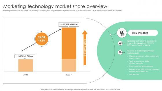 Following slide demonstrates market size summary of marketing technology. It includes key elements such as growth rate in billion, CAGR, and reasons of market share growth.Whether you have daily or monthly meetings, a brilliant presentation is necessary. Marketing Technology Market Share Overview Comprehensive Guide For Marketing Technology can be your best option for delivering a presentation. Represent everything in detail using Marketing Technology Market Share Overview Comprehensive Guide For Marketing Technology and make yourself stand out in meetings. The template is versatile and follows a structure that will cater to your requirements. All the templates prepared by Slidegeeks are easy to download and edit. Our research experts have taken care of the corporate themes as well. So, give it a try and see the results. Following slide demonstrates market size summary of marketing technology. It includes key elements such as growth rate in billion, CAGR, and reasons of market share growth.