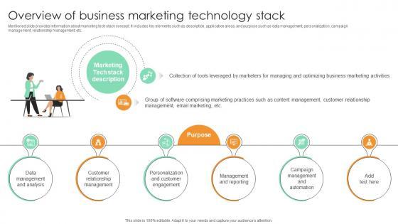 Mentioned slide provides information about marketing tech stack concept. It includes key elements such as description, application areas, and purpose such as data management, personalization, campaign management, relationship management, etc.This modern and well-arranged Overview Of Business Marketing Technology Stack Comprehensive Guide For Marketing Technology provides lots of creative possibilities. It is very simple to customize and edit with the Powerpoint Software. Just drag and drop your pictures into the shapes. All facets of this template can be edited with Powerpoint, no extra software is necessary. Add your own material, put your images in the places assigned for them, adjust the colors, and then you can show your slides to the world, with an animated slide included. Mentioned slide provides information about marketing tech stack concept. It includes key elements such as description, application areas, and purpose such as data management, personalization, campaign management, relationship management, etc.