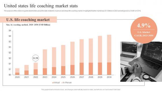The purpose of this slide is to guide stakeholders about the stats related to in-person and virtual life coaching market. It highlights that the market was dollar 1.5 Billion in 2023 and will grow at a CAGR of 4.9 percent. Want to ace your presentation in front of a live audience Our Industry Synopsis Market Analysis United States Life Coaching Market Stats Background Pdf can help you do that by engaging all the users towards you. Slidegeeks experts have put their efforts and expertise into creating these impeccable powerpoint presentations so that you can communicate your ideas clearly. Moreover, all the templates are customizable, and easy-to-edit and downloadable. Use these for both personal and commercial use. The purpose of this slide is to guide stakeholders about the stats related to in-person and virtual life coaching market. It highlights that the market was dollar 1.5 Billion in 2023 and will grow at a CAGR of 4.9 percent.