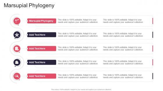 Introducing our well designed Marsupial Phylogeny In Powerpoint And Google Slides Cpb. This PowerPoint design presents information on topics like Marsupial Phylogeny. As it is predesigned it helps boost your confidence level. It also makes you a better presenter because of its high-quality content and graphics. This PPT layout can be downloaded and used in different formats like PDF, PNG, and JPG. Not only this, it is available in both Standard Screen and Widescreen aspect ratios for your convenience. Therefore, click on the download button now to persuade and impress your audience. Our Marsupial Phylogeny In Powerpoint And Google Slides Cpb are topically designed to provide an attractive backdrop to any subject. Use them to look like a presentation pro.