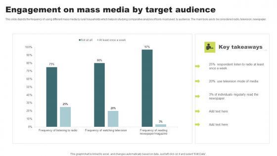 This slide depicts the frequency of using different mass media by rural households which helps in studying comparative analysis of tools most used by audience. The main tools are to be considered radio, television, newspaper. Showcasing this set of slides titled Engagement On Mass Media By Target Audience Portrait Pdf. The topics addressed in these templates are Engagement On Mass Media, Target Audience, Key Takeaways. All the content presented in this PPT design is completely editable. Download it and make adjustments in color, background, font etc. as per your unique business setting. This slide depicts the frequency of using different mass media by rural households which helps in studying comparative analysis of tools most used by audience. The main tools are to be considered radio, television, newspaper.