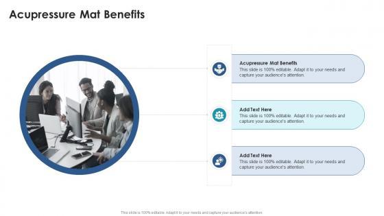 Introducing our well designed Acupressure Mat Benefits In Powerpoint And Google Slides Cpb. This PowerPoint design presents information on topics like Acupressure Mat Benefits. As it is predesigned it helps boost your confidence level. It also makes you a better presenter because of its high quality content and graphics. This PPT layout can be downloaded and used in different formats like PDF, PNG, and JPG. Not only this, it is available in both Standard Screen and Widescreen aspect ratios for your convenience. Therefore, click on the download button now to persuade and impress your audience. Our Acupressure Mat Benefits In Powerpoint And Google Slides Cpb are topically designed to provide an attractive backdrop to any subject. Use them to look like a presentation pro.